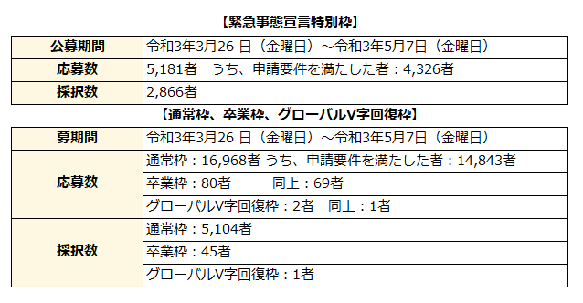 『事業再構築補助金』第1回公募の採択結果について 2021年6月18日2022年10月5日 sci-admin 事業再構築補助金の第1回公募分について、以下の通り、採択結果が公表されました。 第1回公募分の採択結果についてはこちらからご覧ください 「事業再構築補助金」(緊急事態宣言特別枠:第1回公募) 応募のあった5,181者のうち、申請要件を満たした4,326者について審査を行った結果、2,866者を採択。 「事業再構築補助金」(通常枠、卒業枠、グローバルV字回復枠:第1回公募) 応募のあった17,050者のうち、申請要件を満たした14,913者について審査を行った結果、5,150者を採択。