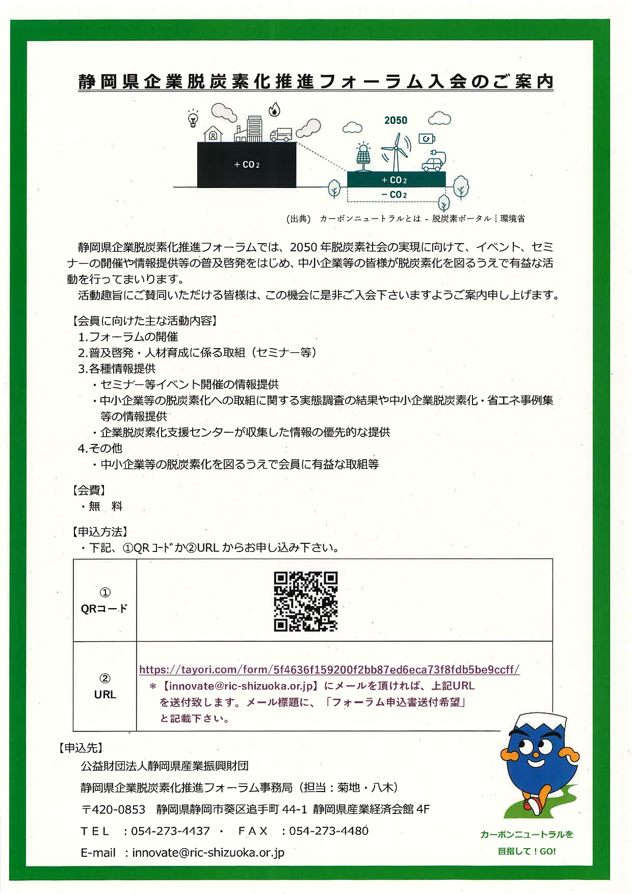 【静岡県産業振興財団】 静岡県企業脱炭素化推進フォーラム入会のご案内 2022年7月14日2022年10月5日 sci-admin 静岡県産業振興財団より、静岡県企業脱炭素化推進フォーラム入会の案内がありましたので、情報提供させていただきます。 ◎問い合わせ先 公益財団法人静岡県企業脱炭素化推進フォーラム事務局(担当:菊地・八木) 〒420-0853 静岡県静岡市葵区追手町44-1 静岡県産業経済会館4F TEL:054-273-4437 FAX:054-273-4480 Mail:innovate@ric-shizuoka.or.jp 詳しくは【静岡県産業振興財団】HPへ