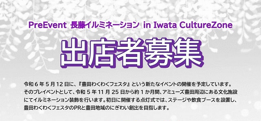 令和6年5月12日に、【豊田わくわくフェスタ】という新たなイベント開催を目指しています。 そのプレイベントとして、11月25日から約1か月間、アミューズ豊田を中心にイルミネーション装飾を行います。 点灯初日には、点灯式を開催し賑わい創出を目指します。